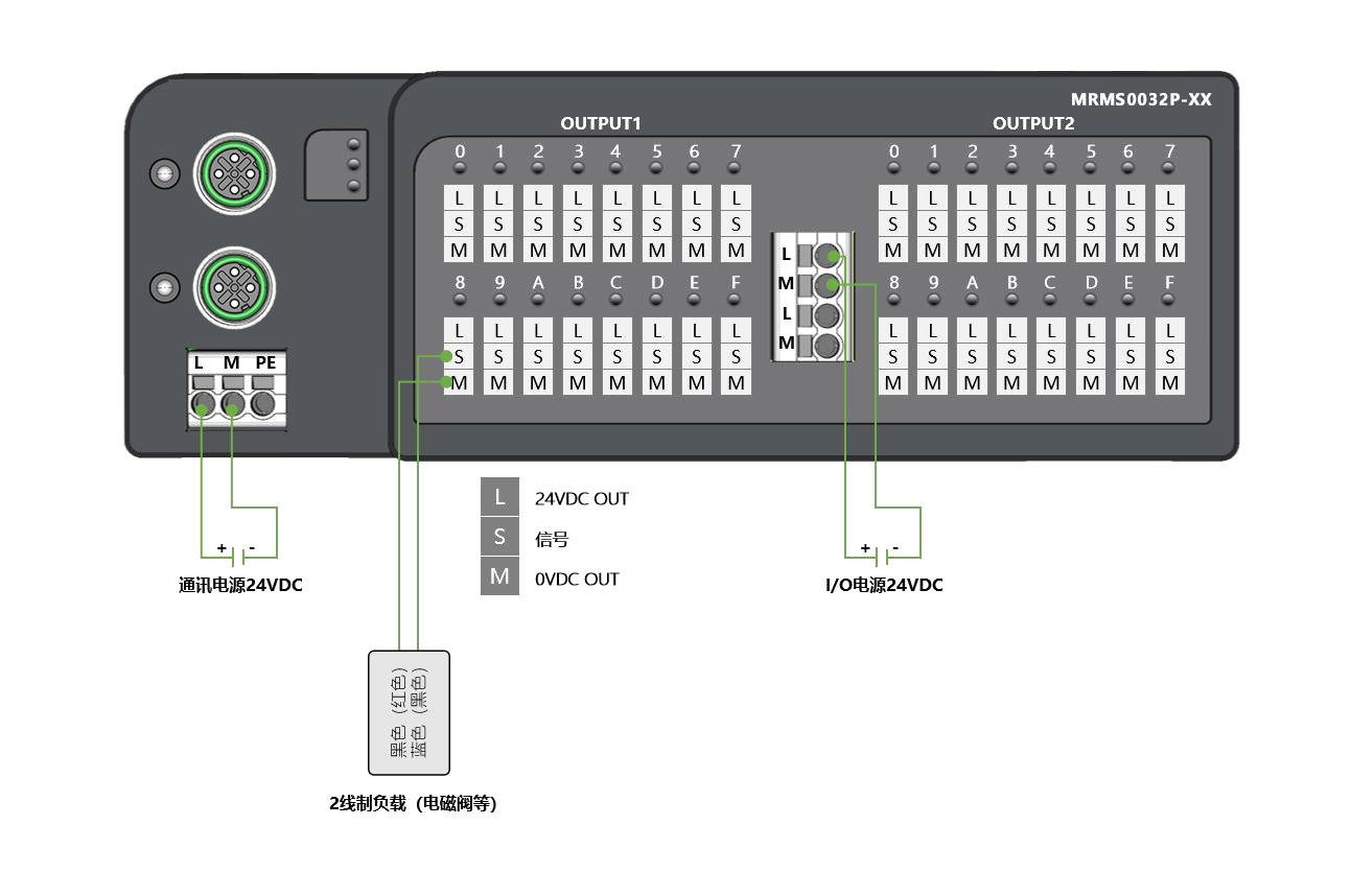 面板式快接線分布式I/O,CC-Link IE FieldBasic通訊,2xM12,可級聯;數字量32出 PNP,24VDC,0.5A,歐式彈簧端子;導軌安裝&打孔安裝(下單時需備注)